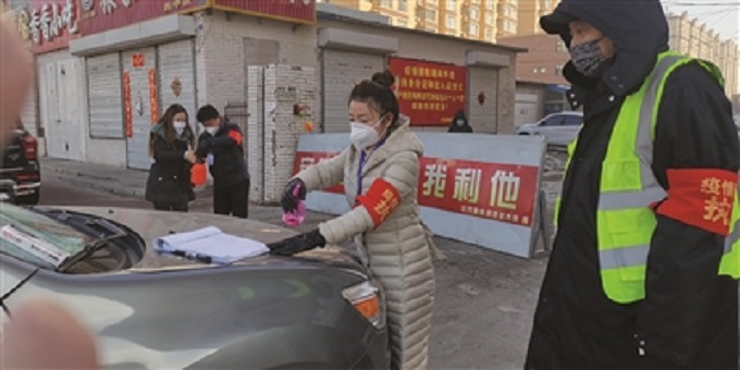 通榆县封闭小区卡点执勤党员正在对进入小区的车辆消毒灭菌。 邹义勇/摄