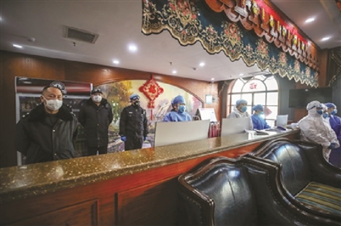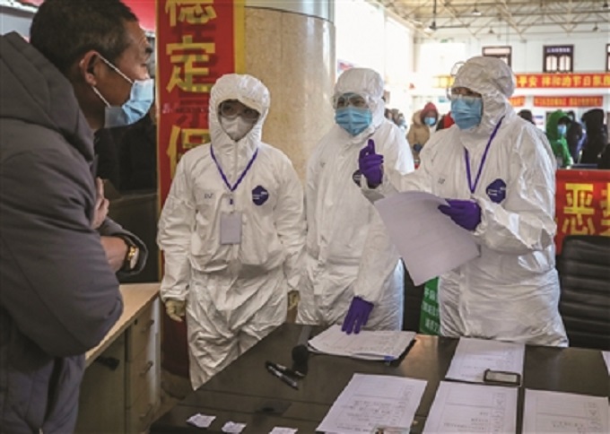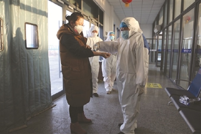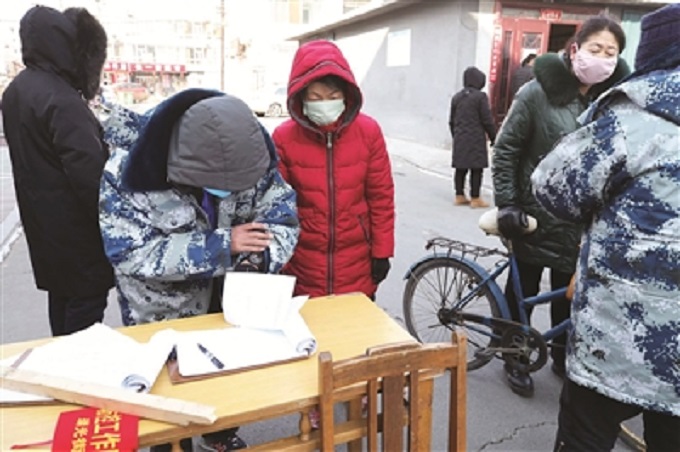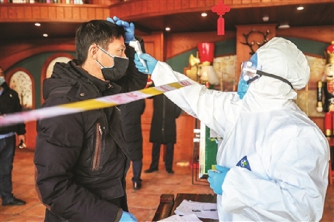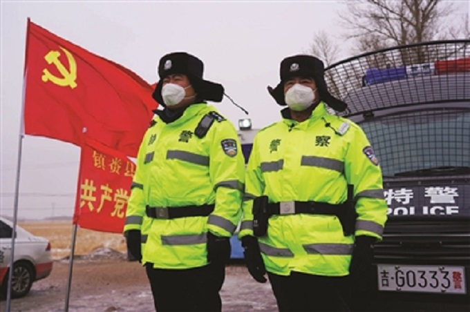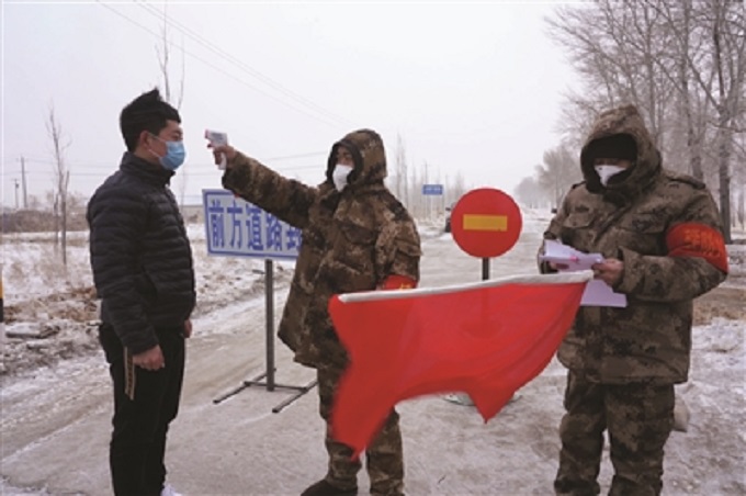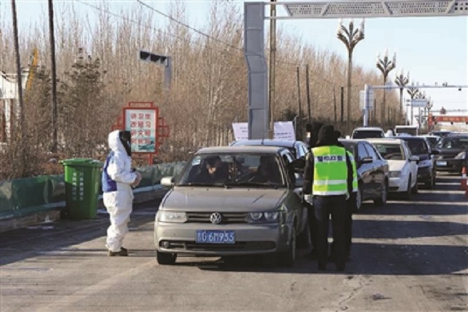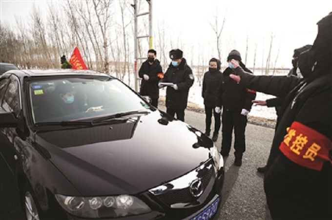 大安市广大医疗工作者、交通干警放弃春节假日休息,上路对来往车辆和人员进行身份登记和测量体温防疫检查。 谷春雷/摄