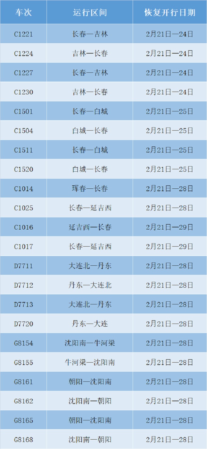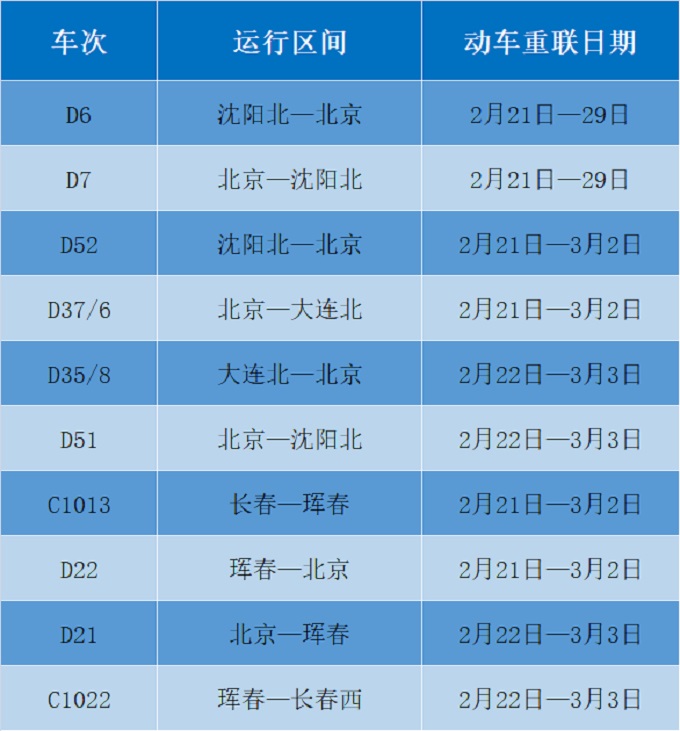 为满足旅客出行需要,沈阳局集团公司根据客流变化,调整优化列车开行方案,22趟动车组列车恢复开行,10趟动车组列车重联运行,助力广大旅客返程返岗。