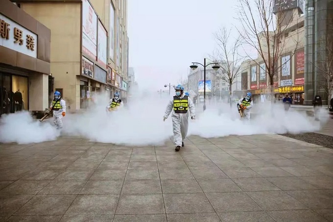 队员们身着防护服,佩戴口罩和护目镜,奔走于商场、居民区和企事业单位等各类场所,把汗水留在夜幕,将安好留给社会。