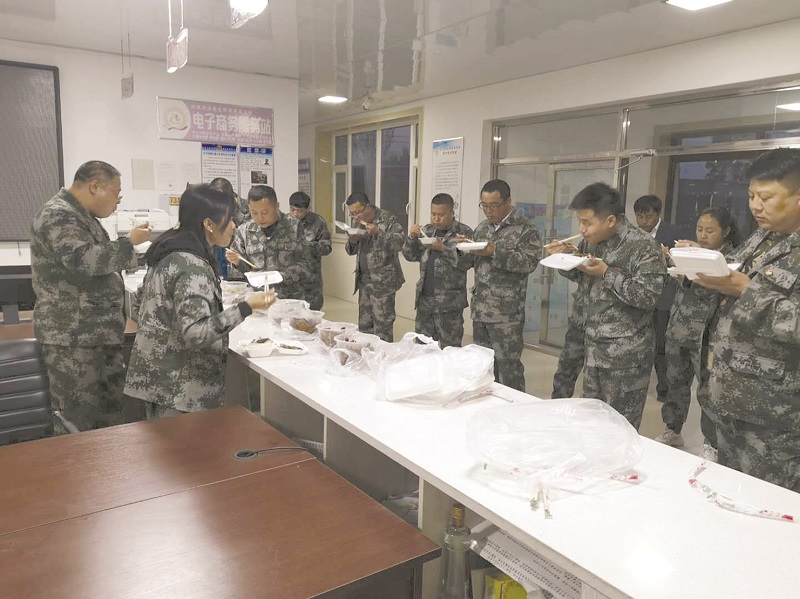 入夜,在到保镇双龙村,突击队员们一边吃盒饭,一边交流当天的走访入户情况。