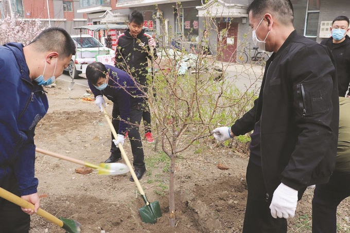 在小区花坛植树现场,志愿者们分工有序,有的挥锹铲土挖坑、有的扶正树苗、有的培土踩实……大家配合默契,确保栽种一棵、成活一棵,为社区居民营造良好的生活环境。