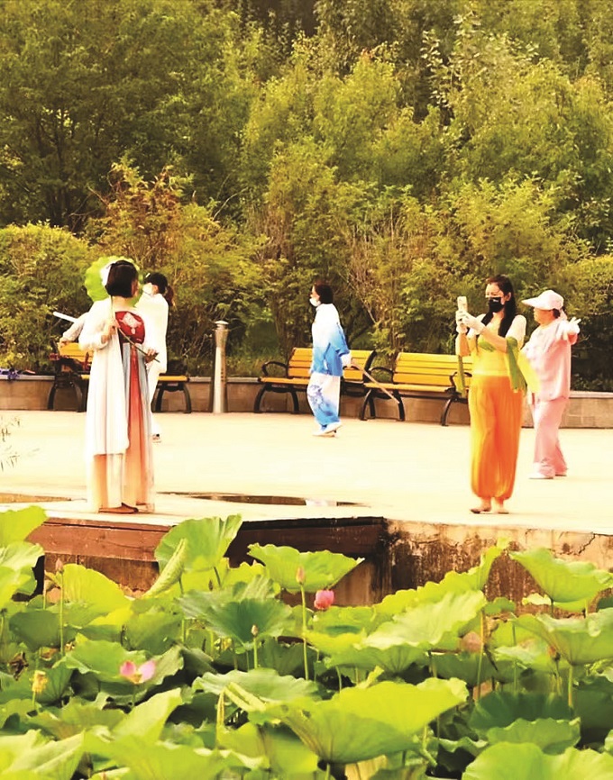 走进洮南市锦湖湿地公园,宛若“长龙”的彩色环湖步道,竞相开放的荷花,蓝天、白云、湖光、花草、树木交相辉映,加上不时传来的欢声笑语,充分彰显着人与自然的和谐之美。