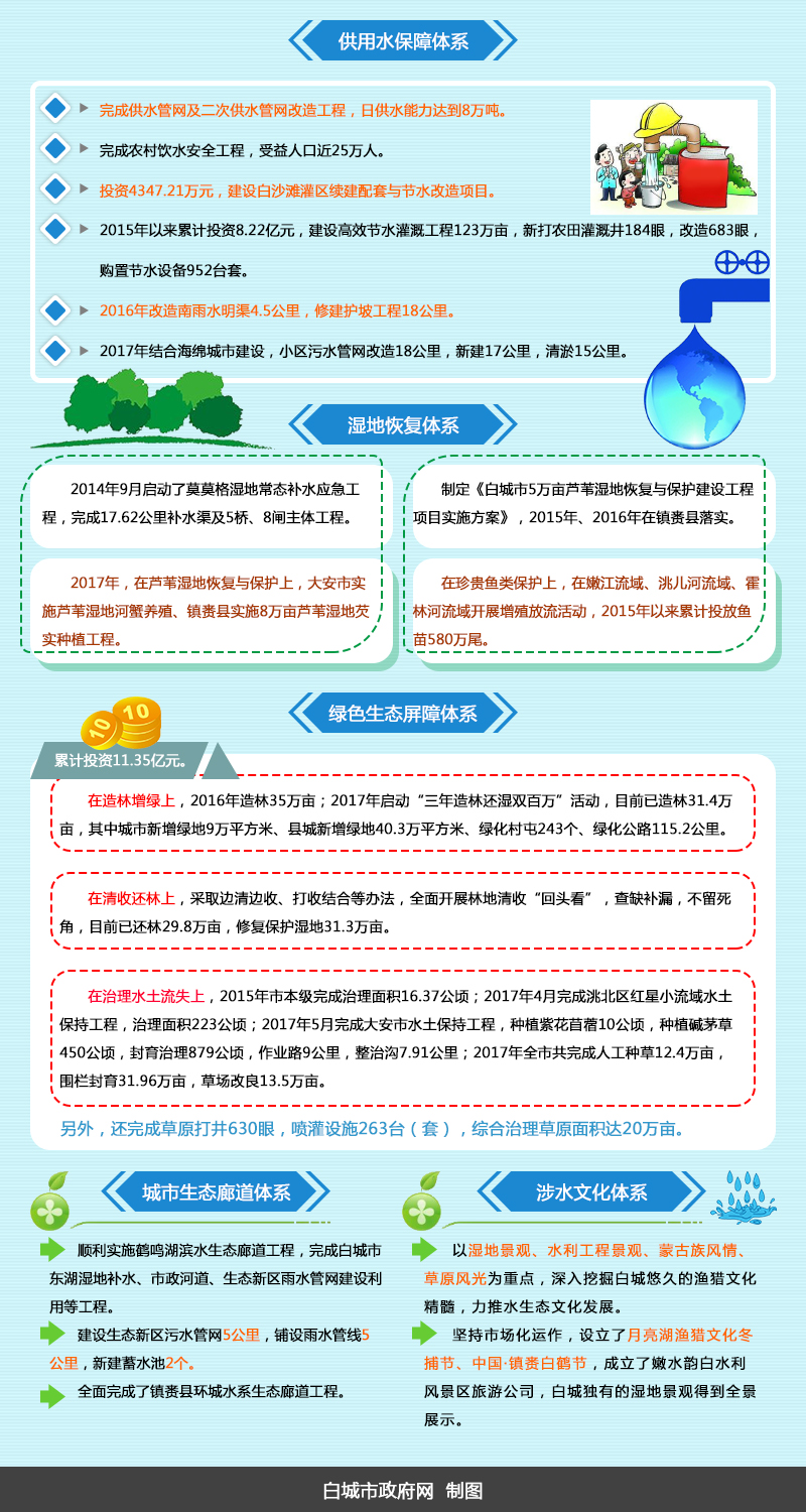 绿色生态屏障体系。累计投资11.35亿元。在造林增绿上,2016年造林35万亩;2017年启动“三年造林还湿双百万”活动,目前已造林31.4万亩,其中城市新增绿地9万平方米、县城新增绿地40.3万平方米、绿化村屯243个、绿化公路115.2公里。在清收还林上,采取边清边收、打收结合等办法,全面开展林地清收“回头看”,查缺补漏,不留死角,目前已还林29.8万亩,修复保护湿地31.3万亩。在治理水土流失上,2015年市本级完成治理面积16.37公顷;2017年4月完成洮北区红星小流域水土保持工程,治理面积223公顷;2017年5月完成大安市水土保持工程,种植紫花苜蓿10公顷,种植碱茅草450公顷,封育治理879公顷,作业路9公里,整治沟7.91公里;2017年全市共完成人工种草12.4万亩,围栏封育31.96万亩,草场改良13.5万亩。另外,还完成草原打井630眼,喷灌设施263台(套),综合治理草原面积达20万亩。