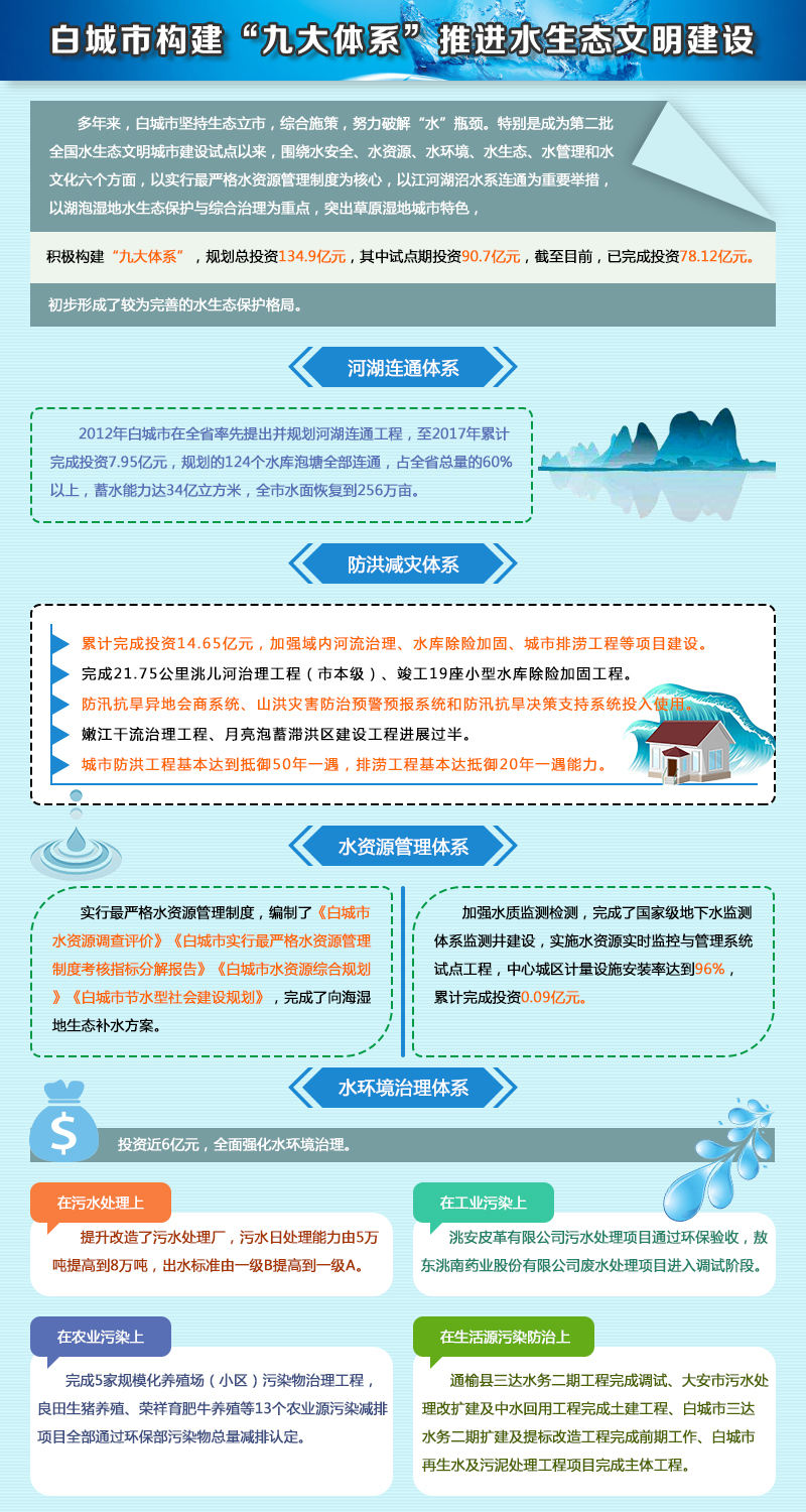 水环境治理体系。投资近6亿元,全面强化水环境治理。在污水处理上,提升改造了污水处理厂,污水日处理能力由5万吨提高到8万吨,出水标准由一级B提高到一级A。在工业污染上,洮安皮革有限公司污水处理项目通过环保验收,敖东洮南药业股份有限公司废水处理项目进入调试阶段。在农业污染上,完成5家规模化养殖场(小区)污染物治理工程,良田生猪养殖、荣祥育肥牛养殖等13个农业源污染减排项目全部通过环保部污染物总量减排认定。在生活源污染防治上,通榆县三达水务二期工程完成调试、大安市污水处理改扩建及中水回用工程完成土建工程、白城市三达水务二期扩建及提标改造工程完成前期工作、白城市再生水及污泥处理工程项目完成主体工程。