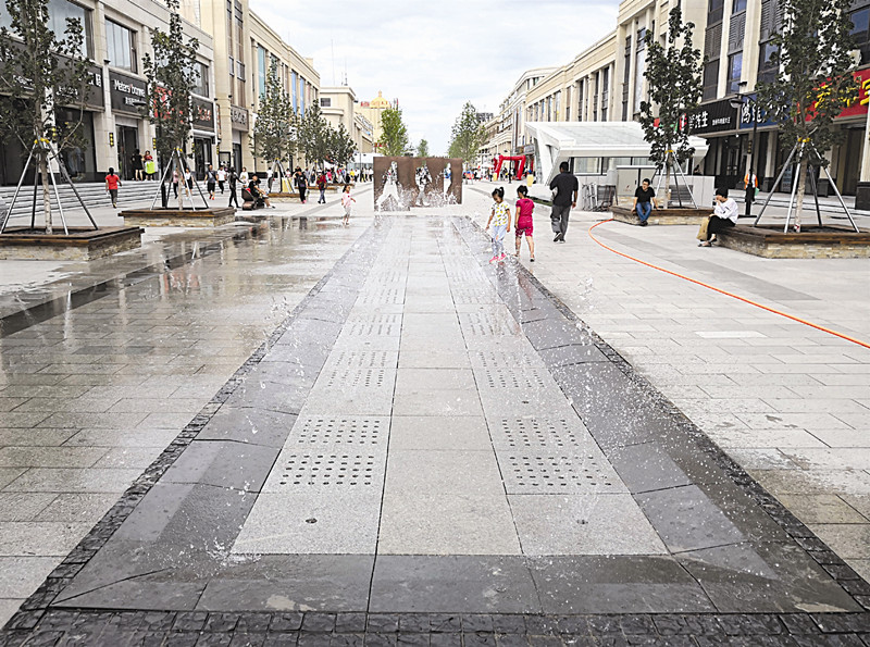 市区海明路步行街喷泉给炎热的夏季带来清凉。