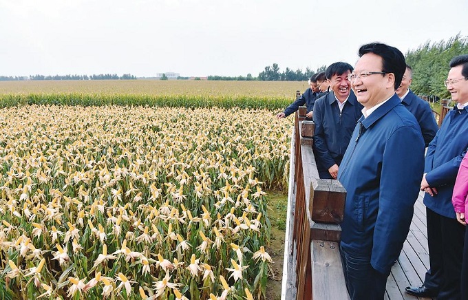 9月22日,省委副书记、省长景俊海来到四平市梨树县国家百万亩绿色食品原料(玉米)标准化生产基地,实地察看黑土地保护性耕作和玉米长势情况。邹乃硕/摄