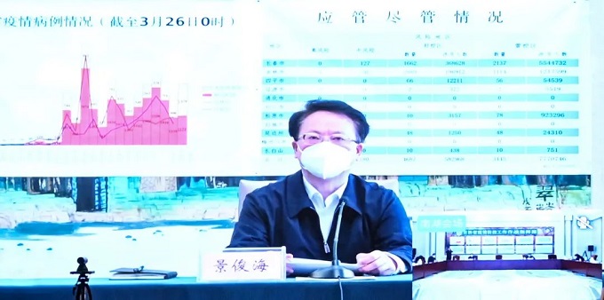 3月26日,省委书记景俊海主持召开全省疫情防控工作视频调度会,专题研究部署生活物资保供、方舱医院建设等工作。