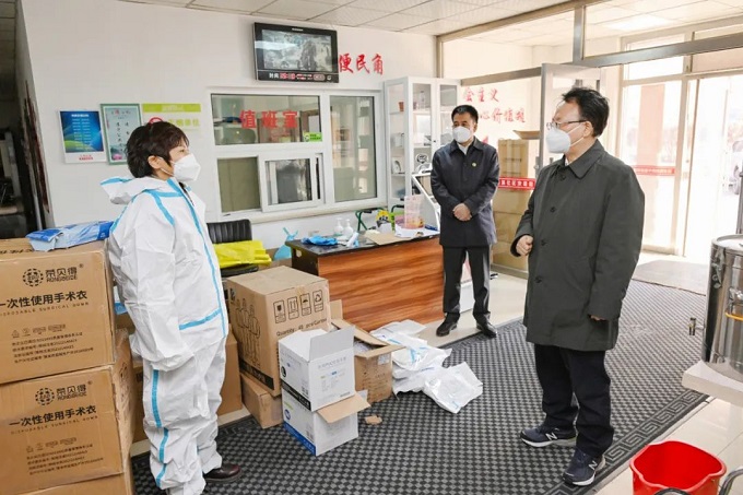 3月27日,省委书记景俊海以“四不两直”方式,在长春暗访检查疫情防控工作,在南关区富裕街道办事处详细了解各项防控措施落实情况。邹乃硕/摄