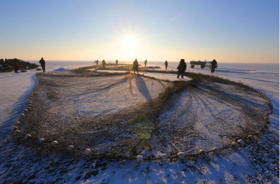 大大的渔网平铺在冰面上,随时准备入水捕鱼。