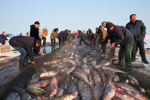 长长的渔网犹如行进在冰面上的一条传送带,将活蹦乱跳的大鱼从冰下输送上来。