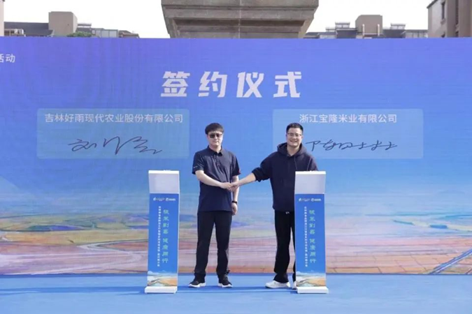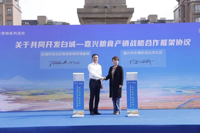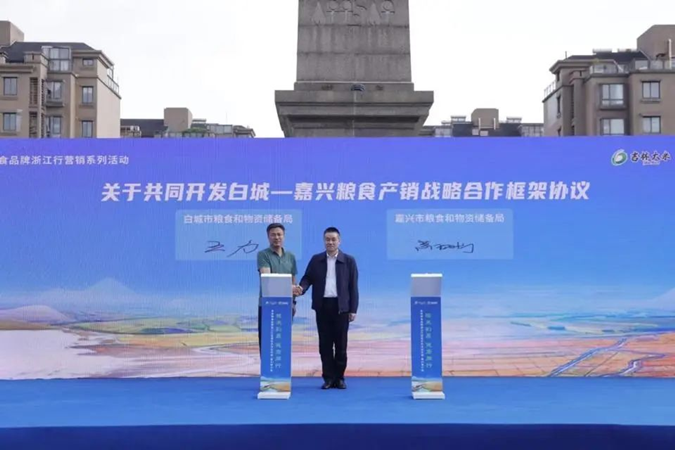 推介会上,白城市粮食和物资储备局与嘉兴市粮食和物资储备局、白城市洮北区粮食和物资储备局与嘉兴市东栅街道云东社区分别签订了《关于共同开发白城—嘉兴粮食产销战略合作框架协议》;吉林佳顿农业科技有限公司与海宁市万盛昌粮油物资有限公司、吉林裕丰米业股份有限公司与嘉兴盛谷粮油有限公司、吉林好雨现代农业股份有限公司与浙江宝隆米业有限公司则分别签署了粮食购销协议。