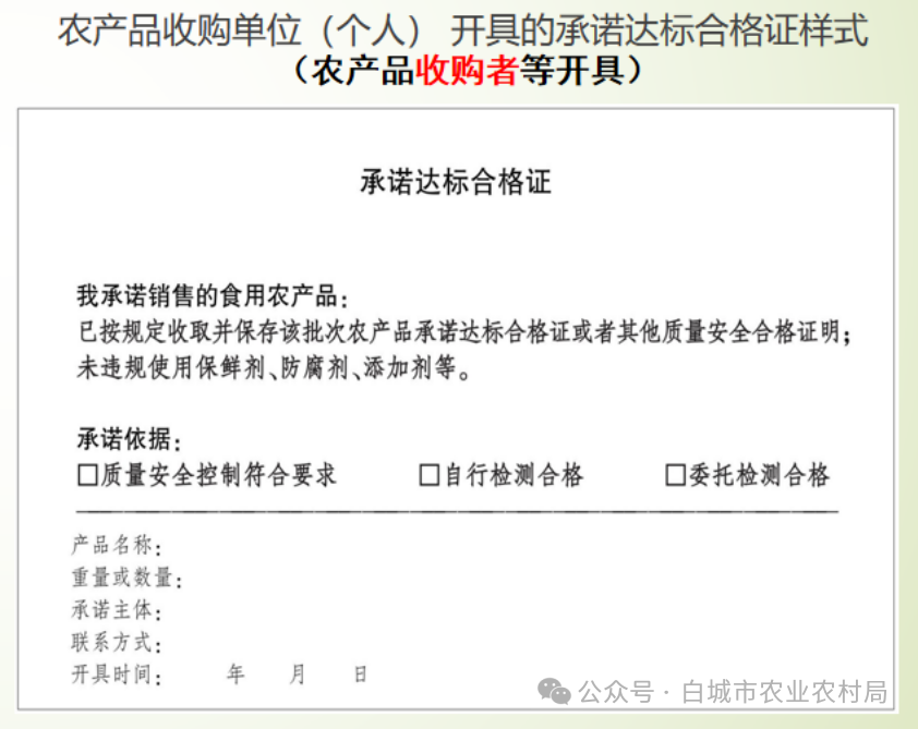 建议广大消费者和餐饮服务经营者,优先采购附具承诺达标合格证的农产品。