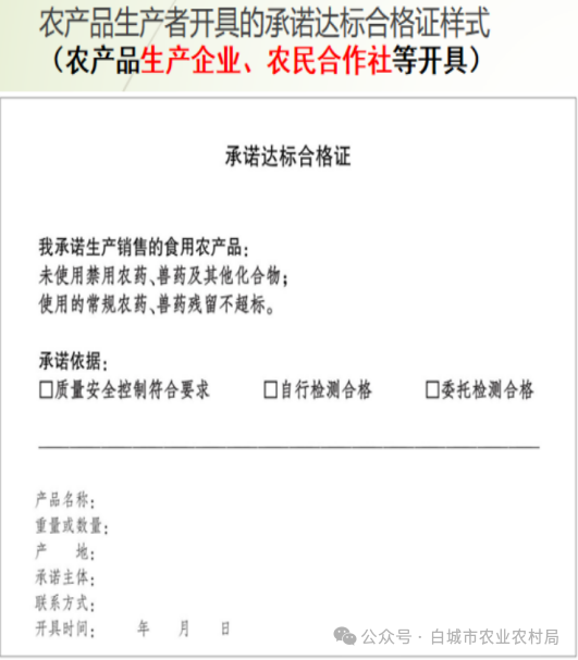 农产品质量安全承诺达标合格证(以下简称“承诺达标合格证”)是指农产品生产企业、农民专业合作社、农户和从事农产品收购的单位或者个人,根据质量安全控制、检测结果等依法开具,承诺其销售的农产品未使用禁用农药、兽药及其他化合物且使用的常规农药、兽药残留不超标等的证明。