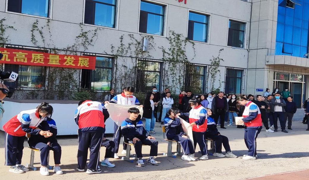 之后是应急包扎救护。场景模拟有个别学生受到坠落物砸伤,学校卫生员紧急对受伤同学进行包扎救护。卫生员对受伤同学的头、胳膊、手、膝等部位的包扎。使用三角巾,膝盖包扎、大悬臂包扎、帽式包扎,使用绷带回返式包扎、螺旋式包扎等。