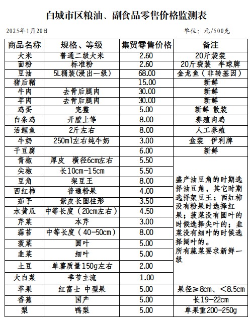 2025年1月20日白城市区粮油、副食零售品价格情况