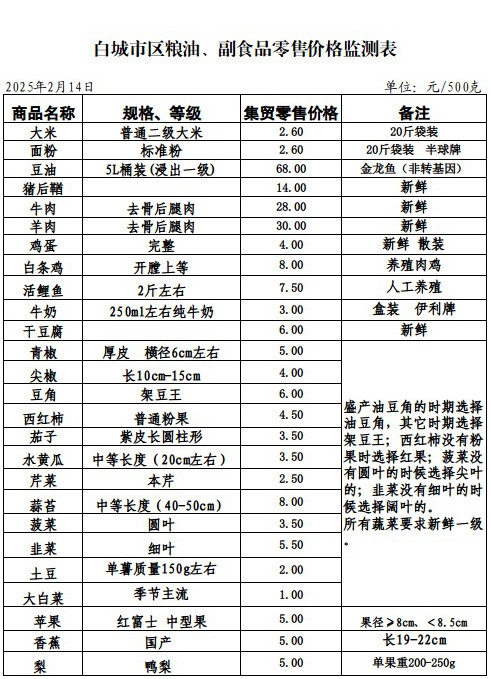 2025年2月14日白城市区粮油、副食品零售价格情况