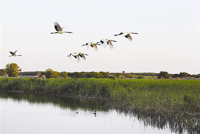 吉林人没有辜负总书记的重托。正如党的十九大代表、白城市委书记庞庆波说的那样,白城市作为吉林西部生态经济区的核心区,承担着改善西部生态环境的历史重任。有水“小江南”,无水“碱巴拉儿”。白城的发展水是生命线,做好水这篇大文章至为关键。近年来,白城着眼构建水、林、草、湿“四位一体”的生态系统,持续实施河湖连通、植树造林、草原治理、湿地修复“四大工程”,构筑吉林西部生态安全屏障。白城市大力实施了河湖连通、引嫩入白、引霍入向等水利工程,通过提、引、蓄、留等多种办法,把洪水富余水量引入众多天然湖泡,形成纵横交错的水域网络。白城河湖连通工程已投资4亿多元,整治渠道145公里,连通水库小湖泊等48个,共改善和恢复湿地面积640平方公里,恢复草原、芦苇面积100多万亩,地下水水位最高时平均上涨1.02米。莫莫格、向海湿地美景再现,更多的天鹅、丹顶鹤等鸟类来此繁衍生息。白城湿地繁殖水鸟比2005年增加了30%,雁、鸭数量达上亿只。
