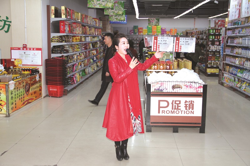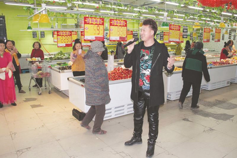 文艺工作者在超市演唱。